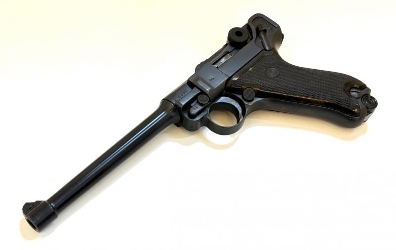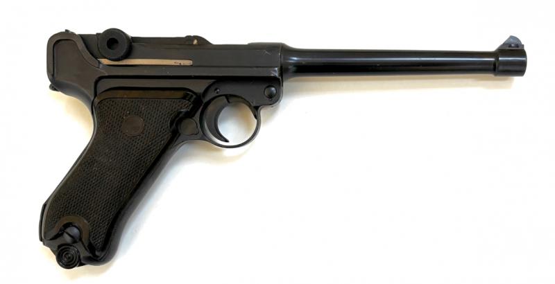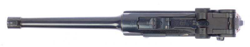 - Pistole Mauser P-08 je v pěkném stavu . Není sčíslovaná . Kdysi na ní , nechal někdo namontovat dlouhou hlaveň . Vývrt má čistý / lesklý . Na pistoli je nová zkušební značka .