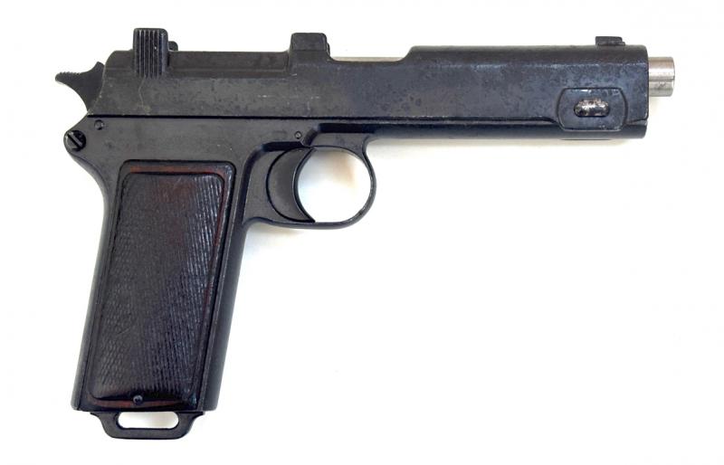 - Použitá , dnes už sbírková pistole Steyr M1912 , je v dobrém originálním stavu . Jde o variantu , vyrobenou pro Rmunsko , v roce 1914 . Povrchová úprava a střenky jsou původní . Vývrt hlavně je čistý/lesklý . Pistole má platnou zkušební značku .