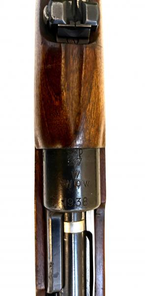 Puška Mod. K98k , je označena kódem 27 a to je firma Erma , vyrobená v roce 1938 . Na zbrani je ještě kód svp ( Z-Brno / Banská Bystrica ) . Puška je v pěkném stavu , ale není sčíslovaná . Vývrt hlavně je čistý , skoro lesklý . Má novou zkušební značku .