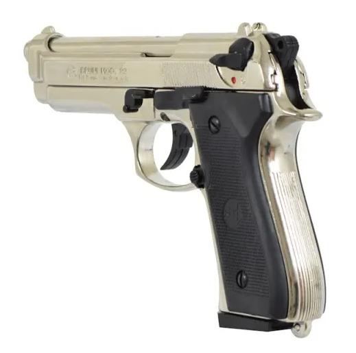 Samonabíjecí model plynové pistole Bruni 92 se zbarveným povrchem do niklové barvy, vyrábí italský výrobce Bruni. Je to věrná replika ostré zbraně Beretta 92 . Konstrukce pistole je ze slitiny kovů, rám pistole je osazen polymerovými střenkami, které mají zdrsněný povrch ( rybinu ). Díky této povrchové úpravě pistole nevykluzuje a pohodlně padne do ruky.U pistole Bruni 92 nechybí manuální pojistka. Nachází se na hlavni vedle kohoutu pistole a má dva režimy: odjištěno a zajištěno. V ústí hlavně je závit určený k montáži nástavce na pyrotechniku. Díky nástavci lze vystřelovat světlice i zábavnou pyrotechiku. Do zásobníku lze nabít až 10 nábojů ráže 9 mm P.A.K. .
