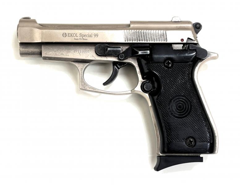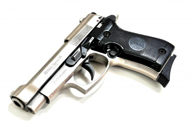 Samonabíjecí plynová pistole EKOL Special 99 , tureckého výrobce EKOL VOLTRAN je replikou velmi známé italské pistole Beretta 85. Pistole není ani příliš velká, ale ani příliš malá, díky tomu je pohodlná při nošení a dobře sedí v dlani, přitom stále vyvolává dojem ostré zbraně.Celokovová konstrukce s pochromovanou lesklou povrchovou úpravou plynové pistole Ekol Special 99 Classic je doplněna o polymerové střenky .Kompaktní rozměry rukojeti , dovolují využívat jednořadý zásobník nábojů. V případě modelu Special 99 jde stále o bohatě dostačující kapacitu 8 ks. střeliva typu 9mm P.A.K..