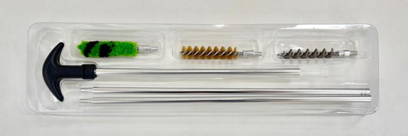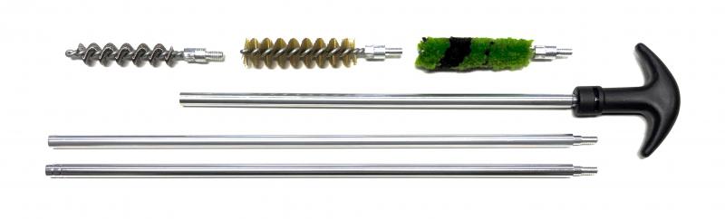 Praktické kompaktní čištění pro zbraně ,v rážích .410 / 36 . Tato sada obsahuje hliníkovou vytěrákovou tyč ,tvrdý drátěný kartáček , mosazný kartáček a lacetku .Tvrdý drátěný kartáček použijte k vyčištění hrubých nečistot a k následnému začištění můžete využít měkký mosazný kartáček , k závěrečnému doleštění a nanesení jemné olejové vrstvy , lacetku .