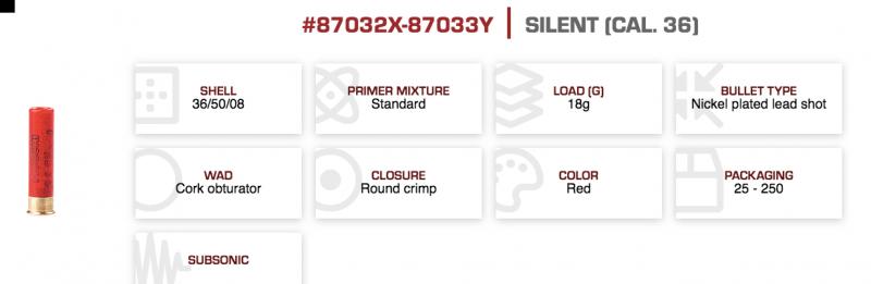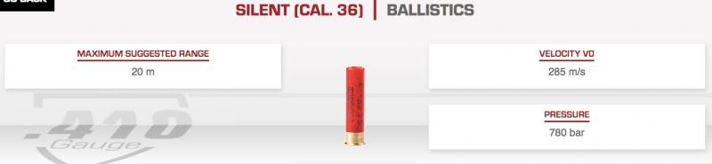 Novinkou pro ráži 36 , je také podzvukový náboj SILENT : vyznačuje se nízkou hlučností a nízkým zpětným rázem v ráži 36 / 50mm , s brokovou navážkou 18 g . K dispozici ve velikostech broků od 8 do 11. Pro lov malých až středních stěhovavých ptáků a drobné škodné . Ideální jsou také pro výcvik psů , kterým umožňuje postupně si zvykat na střelbu z brokovnice .