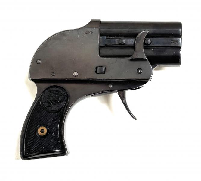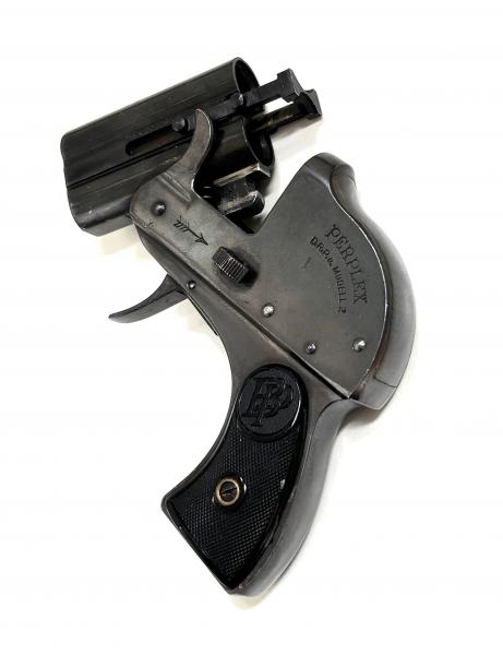 Použitá plynová a nebo signální pistole PERPLEX Mod. 2 , je ve velmi pěkném , originálním stavu . Byla vyráběna firmou Bernhard Paatz , před druhou světovou válkou v Zella-Mehlis . Byla určena pro sebeobranu a k zahnání nebezpečných zvířat . 12mm náboje obsahovali tabákový prach . Tato pistole má vyrobní číslo 87 . POZOR , ač plynovka , byla tato sebeobranná pistolka zařazena do kategorie R3 . Co kdyby náhodou ..... . Takže k nákupu je potřeba ZO a NP .